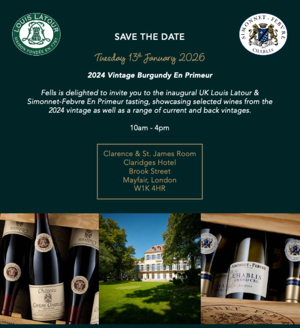 - The Maison Louis Latour and Simonnet-Febvre 2024 vintage Burgundy en primeur tasting takes place on January 13 at Clarence & St James’ Room, Claridges Hotel, Brook Street, London, W1K 4HR between 10am and 4pm. To register email florence.fagan@fells.co.uk.